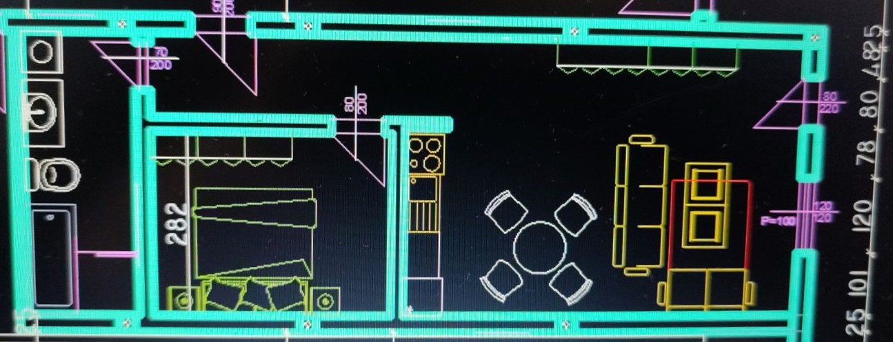 Velika dnevna soba sa kuhinjskim i trpezarijskim delom, spavaća soba sa tušem i veliko kupatilo-wc.