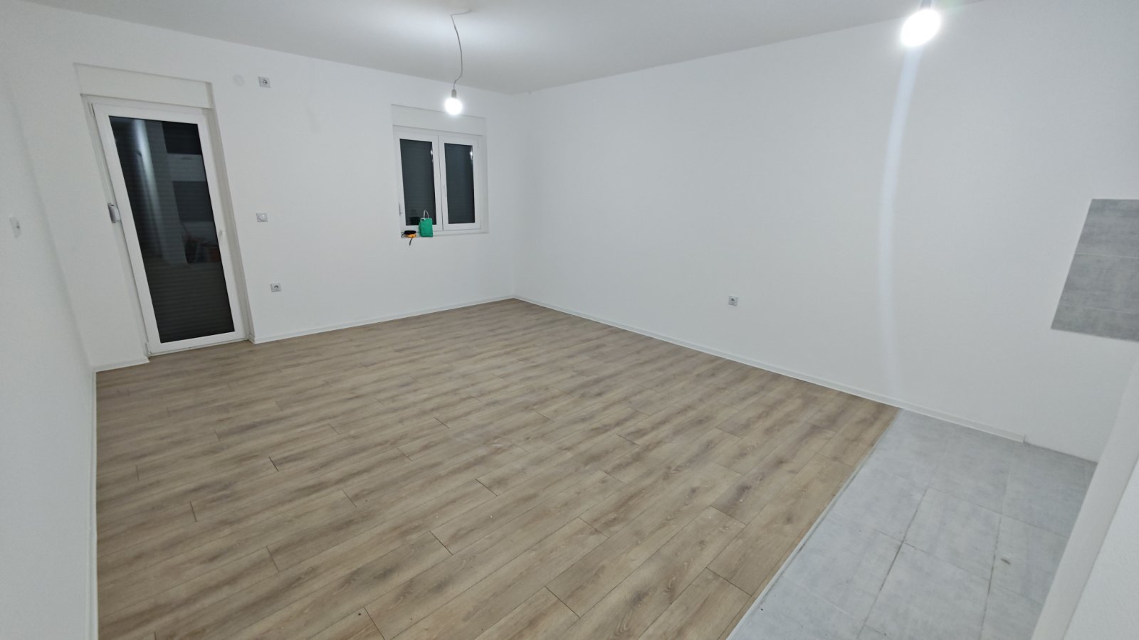 Sigurnosna vrata, na podu laminat, PVC spoljna stolarija, kuhinja sa podnim i zidnim pločicama bez elemenata.