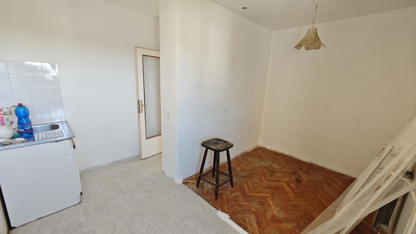 Kuhinja sa trpezarijom i soba sa izlazom na terasu (gleda ka ulici).